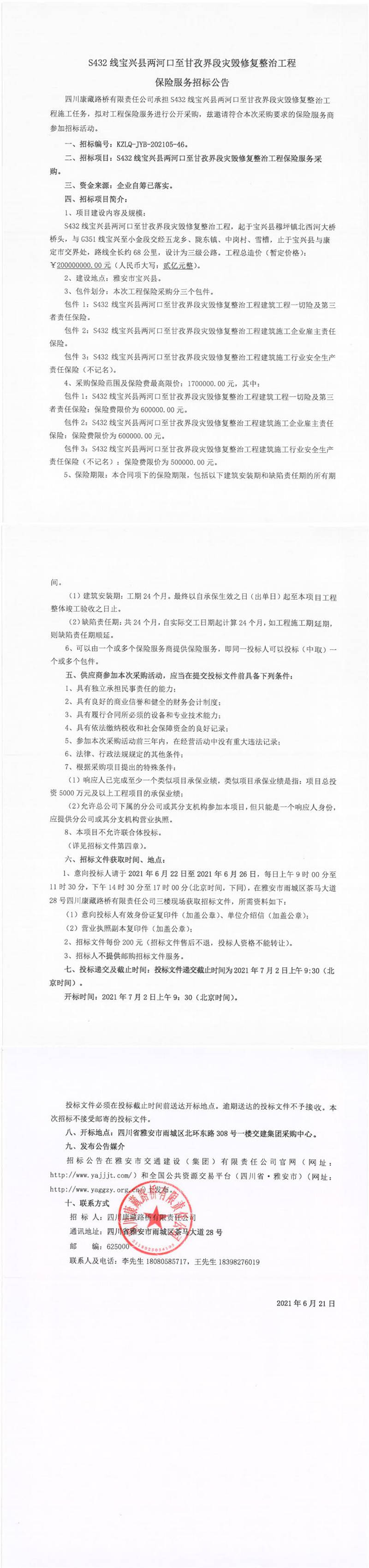 四川康藏路橋有限責(zé)任公司S432線寶興縣兩河口至甘孜界段災(zāi)毀修復(fù)整治工程保險服務(wù)招標(biāo)公告