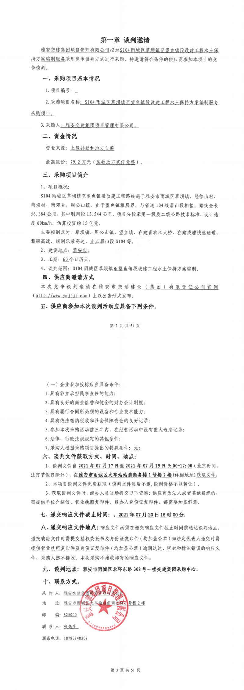 雅安交建集團(tuán)項目管理有限公司S104雨城區(qū)草壩鎮(zhèn)至望魚段改建工程水土保持方案編制服務(wù)采購項目競爭談判公告