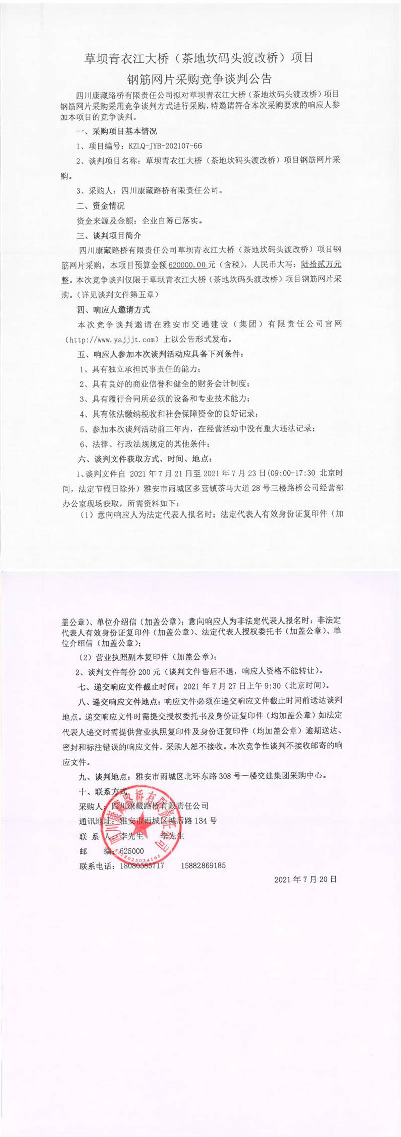 四川康藏路橋有限責(zé)任公司草壩青衣江大橋(茶地坎碼頭渡改橋)項目鋼筋網(wǎng)片采購競爭談判公告