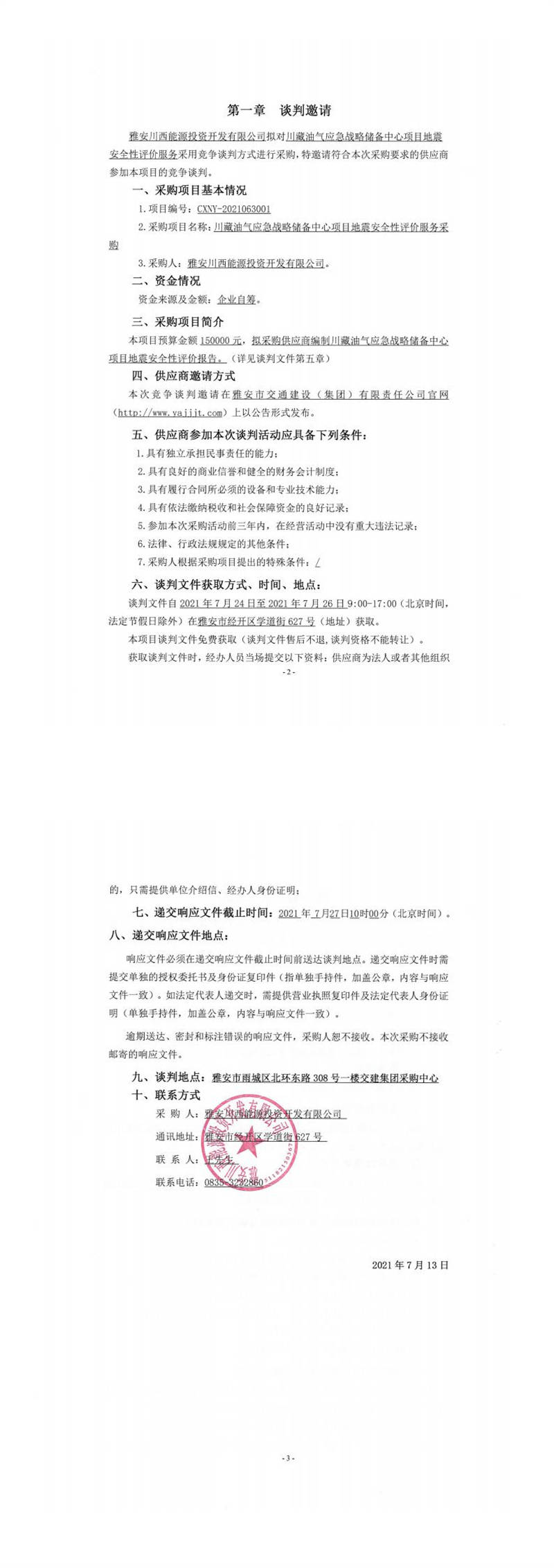 雅安川西能源投資開發(fā)有限公司川藏油氣應(yīng)急戰(zhàn)略儲(chǔ)備中心項(xiàng)目地震安全性評(píng)價(jià)服務(wù)采購競爭談判公告