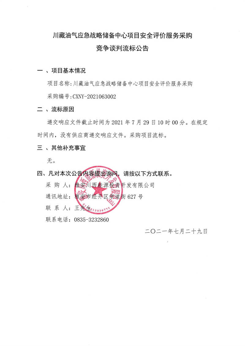 雅安川西能源投資開發(fā)有限公司川藏油氣應(yīng)急戰(zhàn)略儲(chǔ)備中心項(xiàng)目安全評(píng)價(jià)服務(wù)采購(gòu)競(jìng)爭(zhēng)談判流標(biāo)公告
