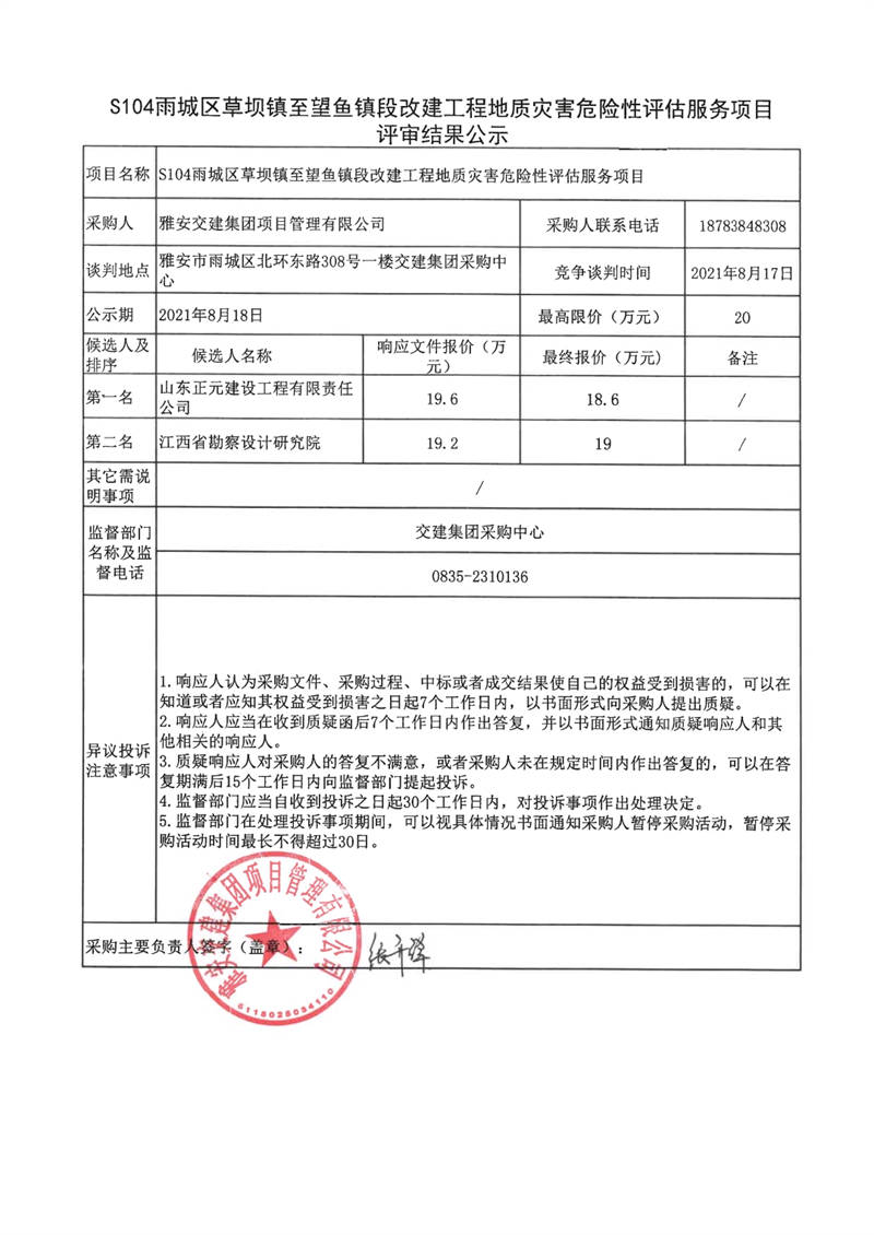 雅安交建集團(tuán)項(xiàng)目管理有限公司S104雨城區(qū)草壩鎮(zhèn)至望魚鎮(zhèn)改建工程地質(zhì)災(zāi)害危險性評估服務(wù)項(xiàng)目評審結(jié)果公示