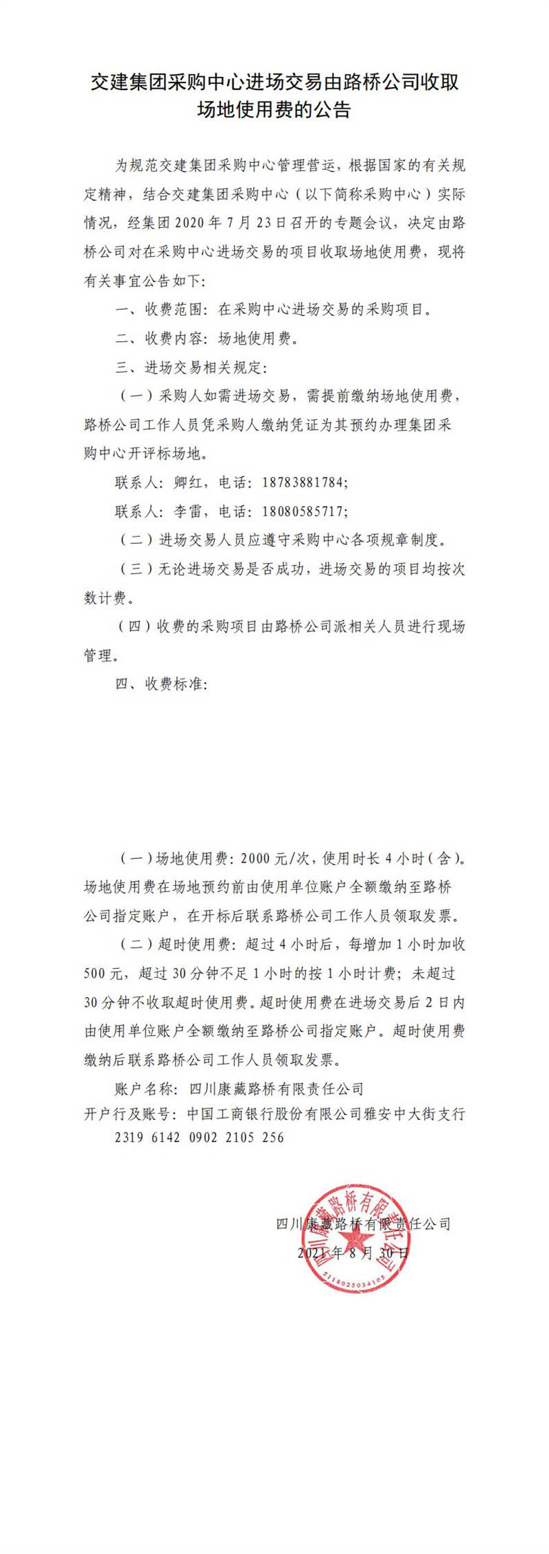 交建集團(tuán)采購中心進(jìn)場交易由路橋公司收取場地使用費(fèi)的公告