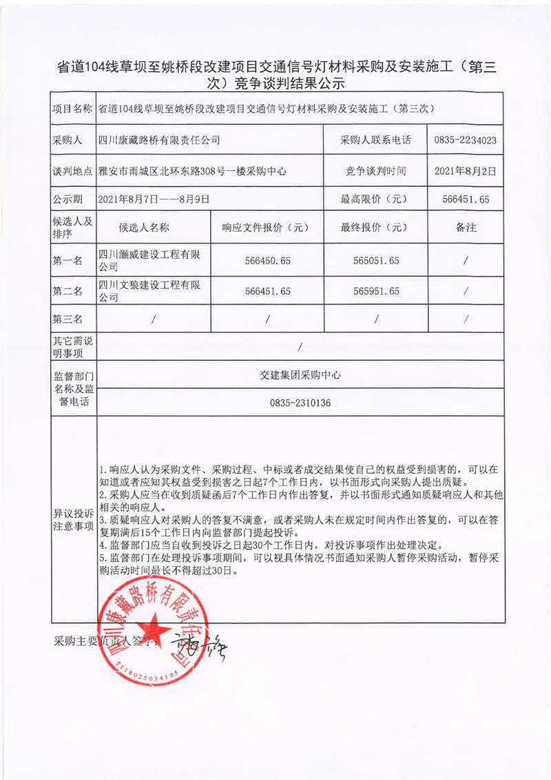 四川康藏路橋有限責(zé)任公司省道104線草壩至姚橋改建項(xiàng)目交通信號(hào)燈材料采購及安裝施工(第三次)競爭談判結(jié)果公示