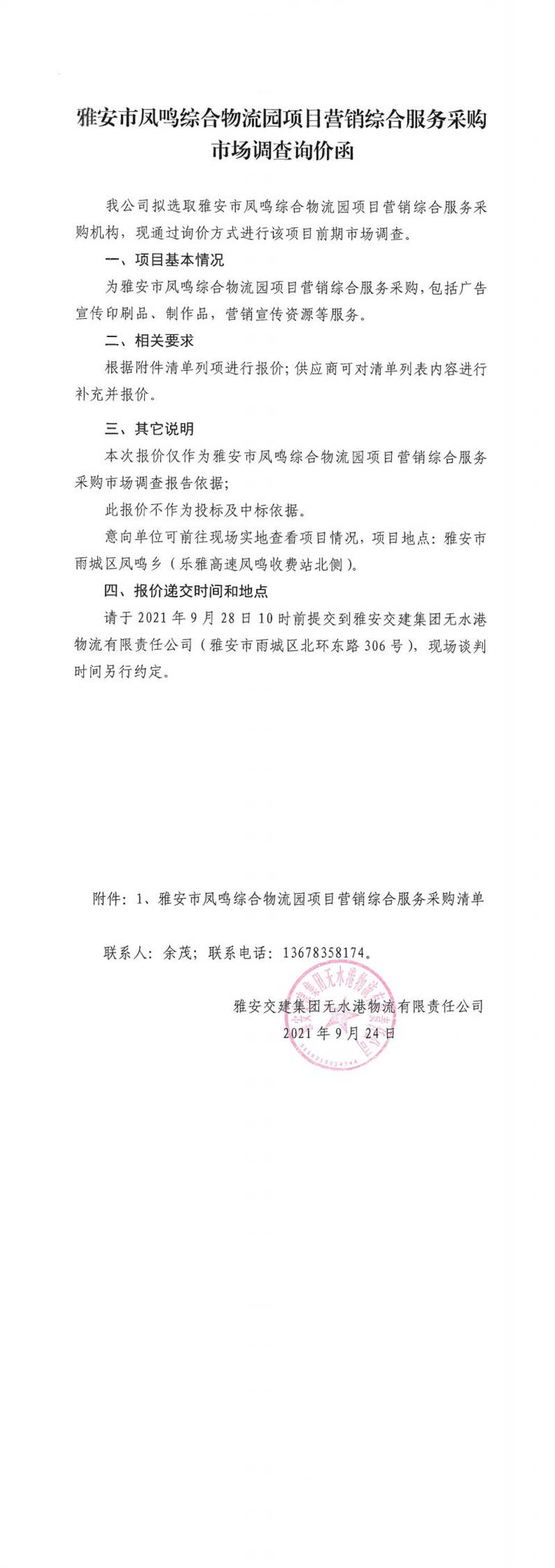 雅安交建集團(tuán)無(wú)水港物流有限責(zé)任公司雅安市鳳鳴綜合物流園項(xiàng)目營(yíng)銷(xiāo)綜合服務(wù)采購(gòu)市場(chǎng)調(diào)查詢(xún)價(jià)函