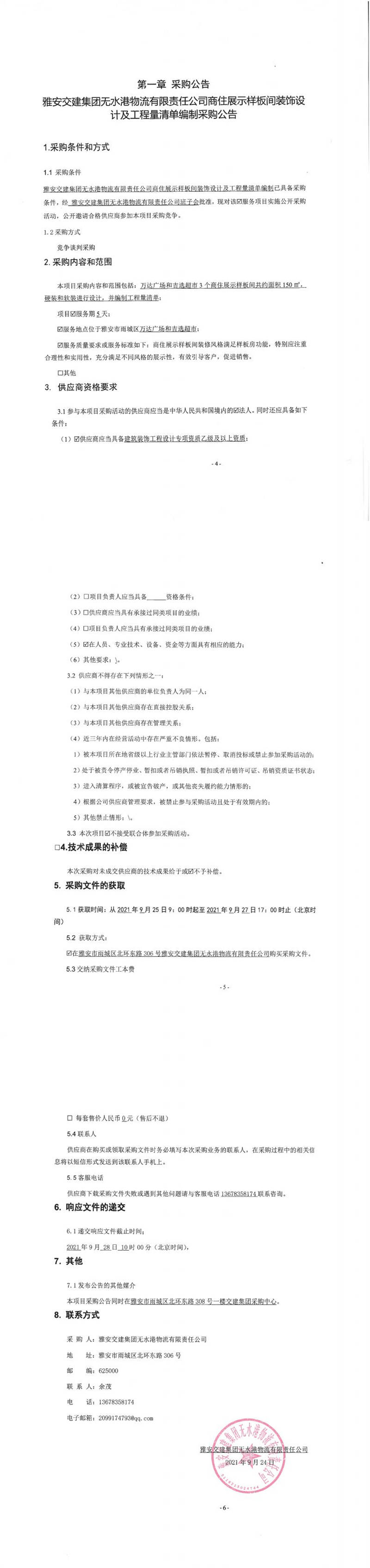 雅安交建集團(tuán)無水港物流有限責(zé)任公司商住展示樣板間裝飾設(shè)計(jì)及工程量清單編制采購公告