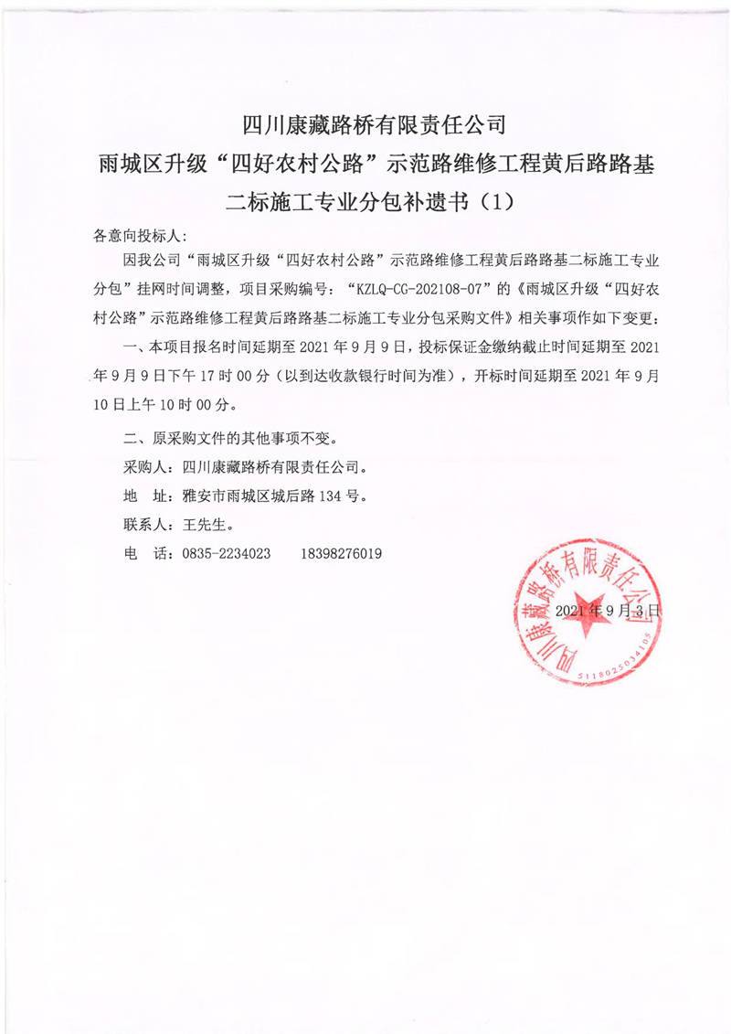 四川康藏路橋有限責(zé)任公司雨城區(qū)升級(jí)“四好農(nóng)材公路”示范路維修工程黃后路路基二標(biāo)施工專業(yè)分包補(bǔ)遺書(1)
