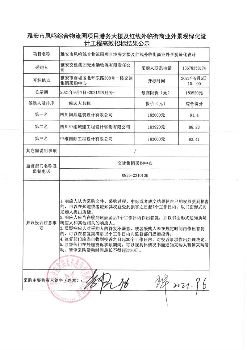 雅安交建集團(tuán)無水港物流有限責(zé)任公司雅安市鳳鳴綜合物流園項(xiàng)目港務(wù)大樓及紅線外臨街商業(yè)外景觀綠化設(shè)計(jì)工程高效招標(biāo)結(jié)果公示