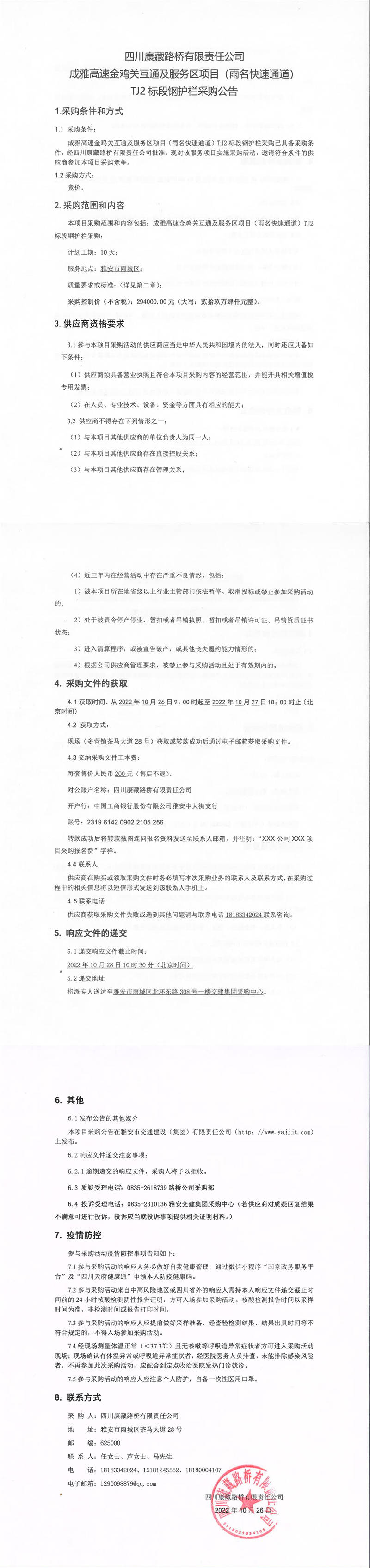 四川康藏路橋有限責任公司成雅高速金雞關(guān)互通及服務區(qū)項目(雨名快速通道)TJ2標段鋼護欄采購公告