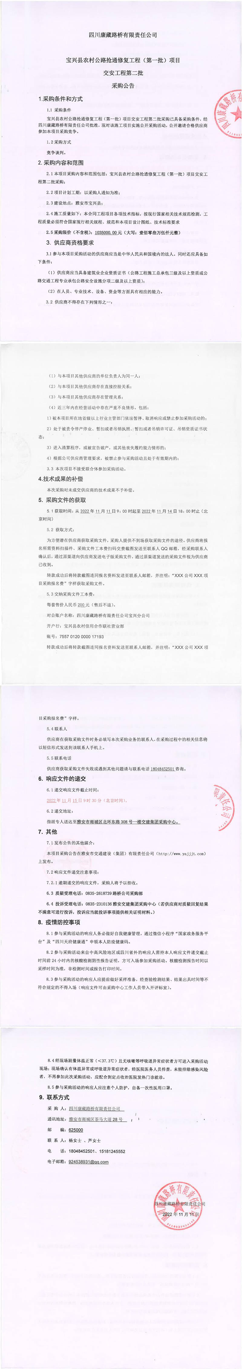 四川康藏路橋有限責(zé)任公司寶興縣農(nóng)村公路搶通修復(fù)工程(第一批)項(xiàng)目交安工程第二批采購公告