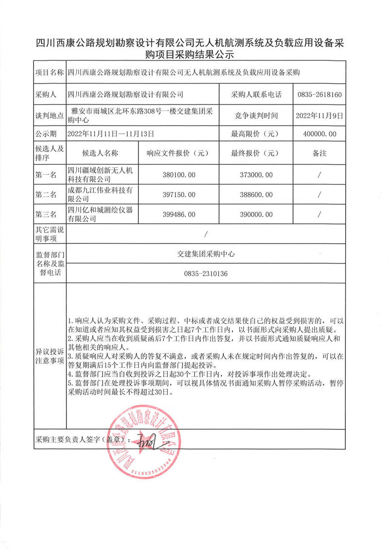 四川西康公路規(guī)劃勘察設(shè)計有限公司無人機航測系統(tǒng)及負載應用設(shè)備采購項目采購結(jié)果公示