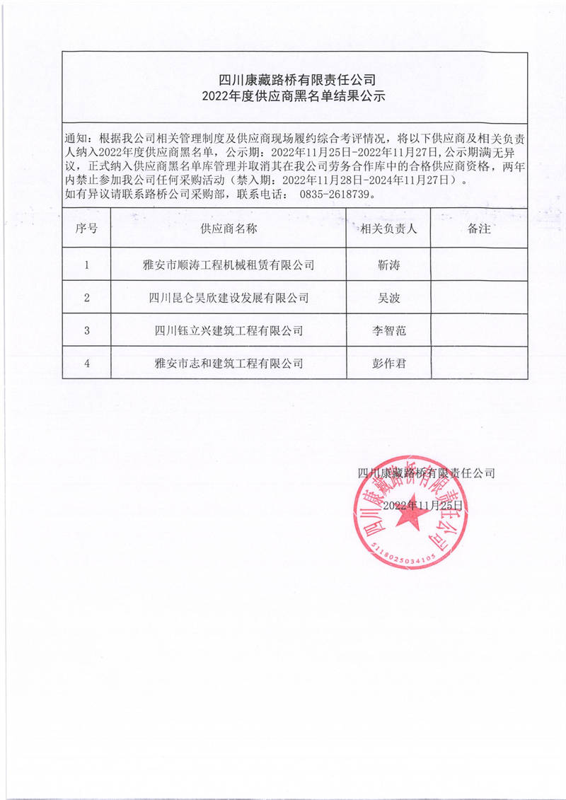 四川康藏路橋有限責任公司2022年度供應商黑名單結果公示
