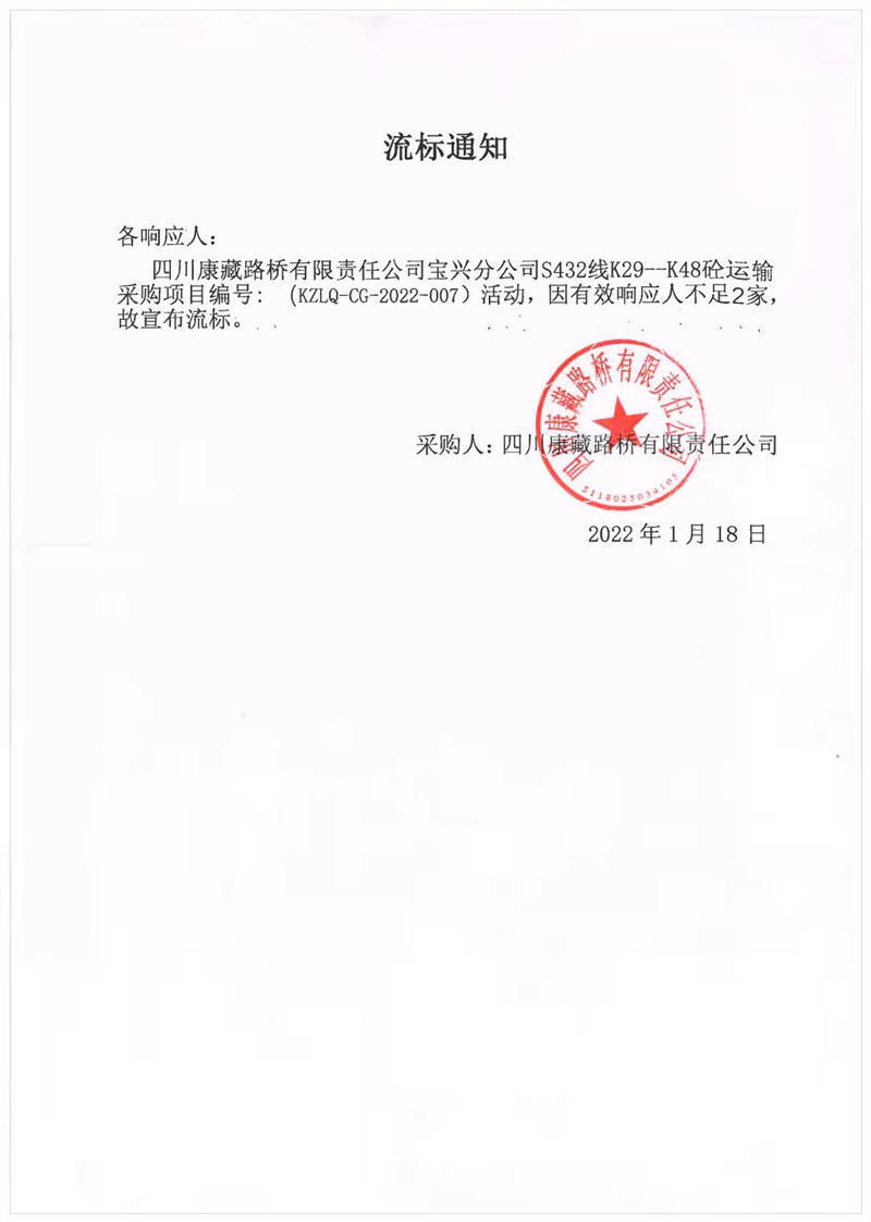 四川康藏路橋有限責(zé)任公司寶興分公司S432線K29-K48砼運(yùn)輸采購項(xiàng)目流標(biāo)通知