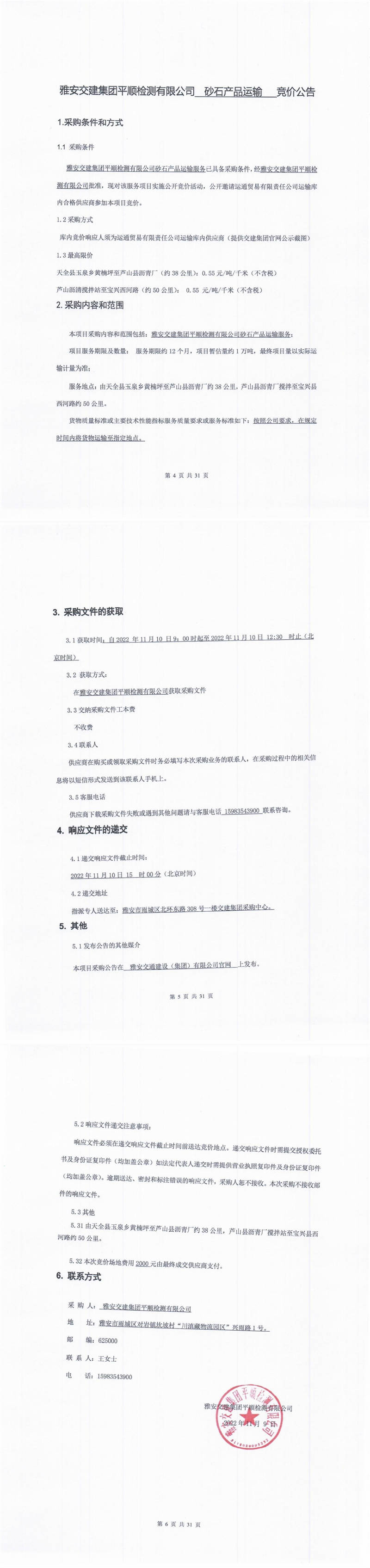 雅安交建集團平順檢測有限公司砂石產品運輸競價公告