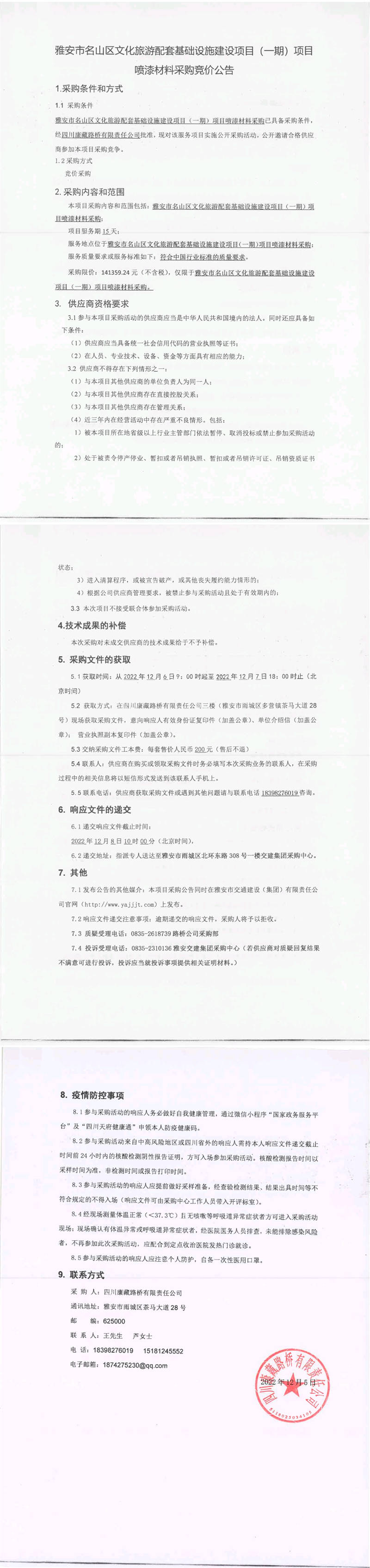四川康藏路橋有限責(zé)任公司雅安市名山區(qū)文化旅游配套基礎(chǔ)設(shè)施建設(shè)項(xiàng)目(一期)項(xiàng)目噴漆材料采購(gòu)競(jìng)價(jià)公告