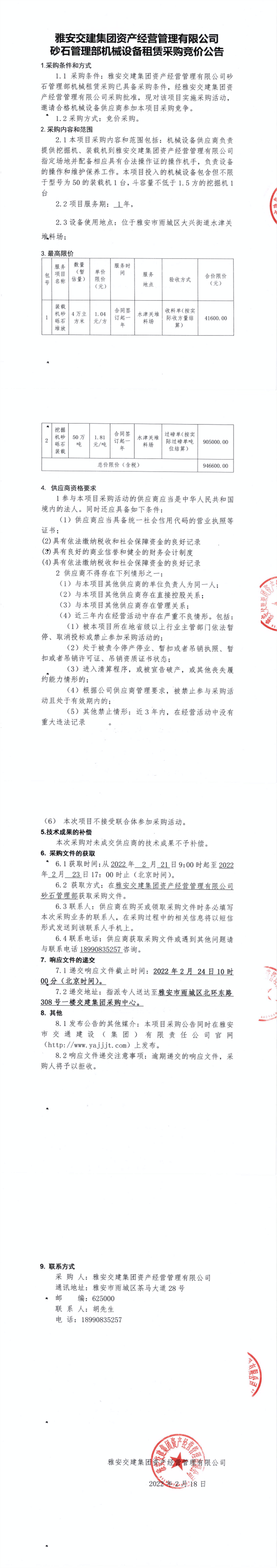 雅安交建集團資產(chǎn)經(jīng)營管理有限公司砂石管理部機械設(shè)備租賃采購競價公告