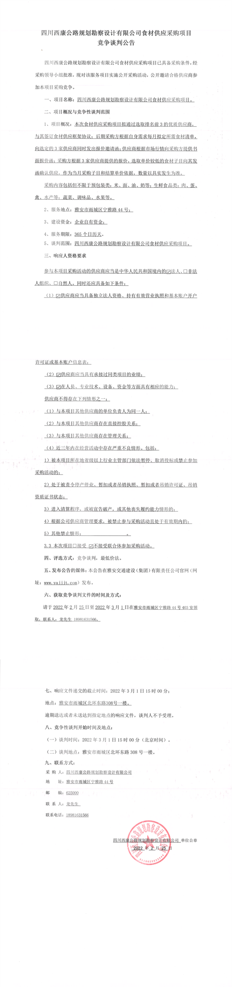 四川西康公路規(guī)劃勘察設(shè)計有限公司食材供應(yīng)采購項目競爭談判公告