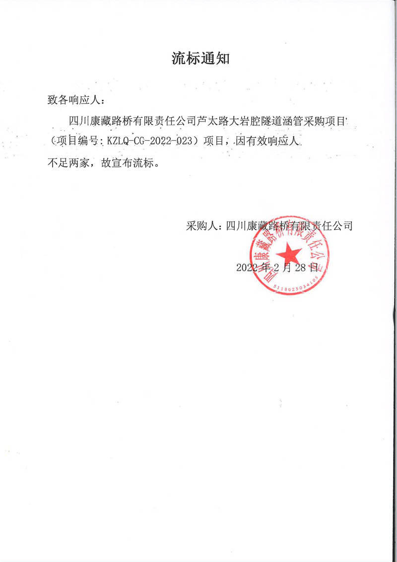 四川康藏路橋有限責(zé)任公司蘆太路大巖腔隧道涵管采購項(xiàng)目流標(biāo)通知