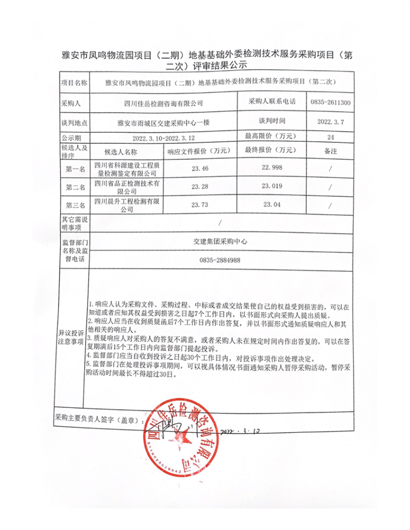 四川佳岳檢測咨詢有限公司雅安市鳳鳴物流園項(xiàng)目(二期)地基基礎(chǔ)外委檢測技術(shù)服務(wù)采購項(xiàng)目(第二次)評審結(jié)果公示