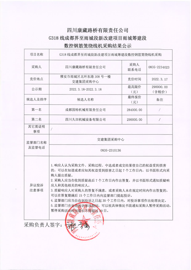 四川康藏路橋有限責任公司G318線成都界至雨城段新改建項目雨城籌建段數(shù)控鋼筋籠繞線機采購結(jié)果公示