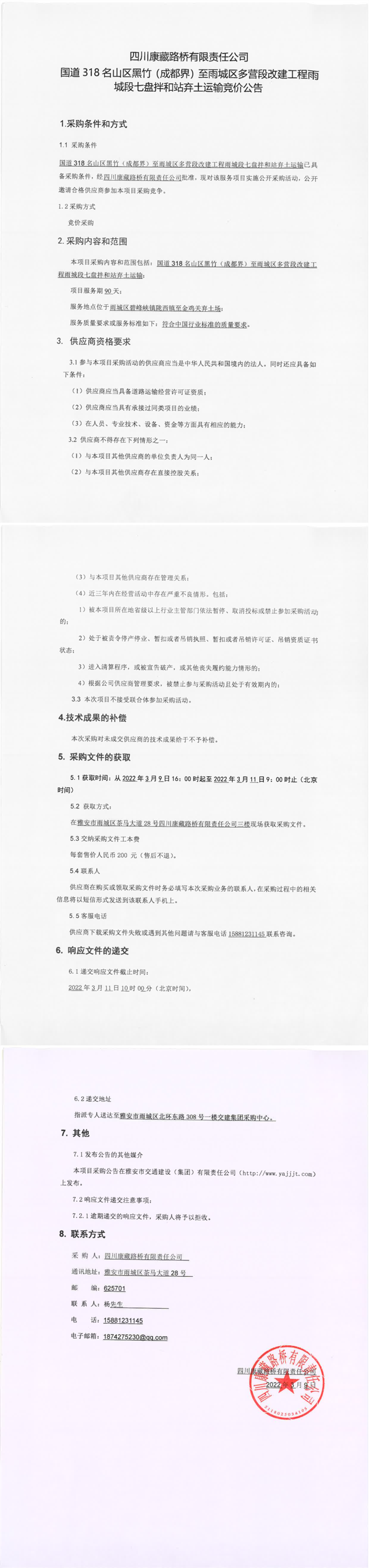 四川康藏路橋有限責(zé)任公司國(guó)道318名山區(qū)黑竹(成都界)至雨城區(qū)多營(yíng)段改建工程雨城段七盤(pán)拌和站棄土運(yùn)輸競(jìng)價(jià)公告