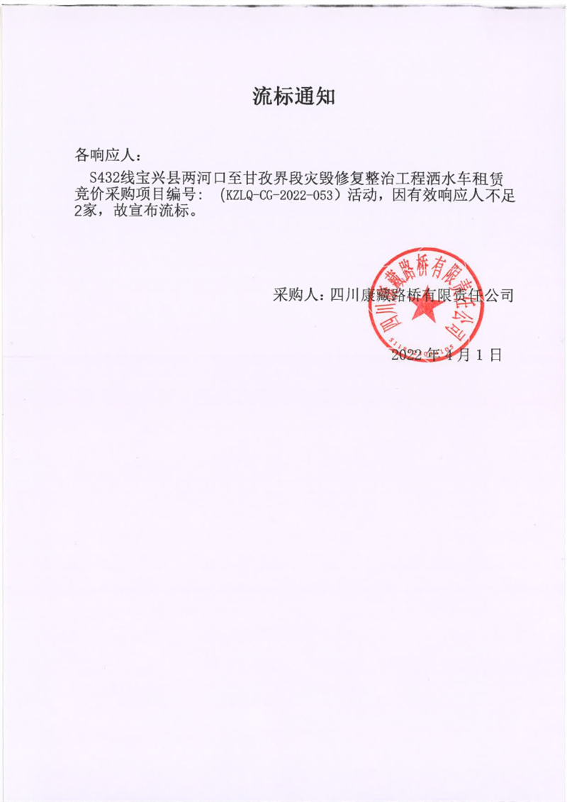 四川康藏路橋有限責(zé)任公司S432線寶興縣兩河口至甘孜界段災(zāi)毀修復(fù)整治工程灑水車租賃競價采購項(xiàng)目流標(biāo)通知