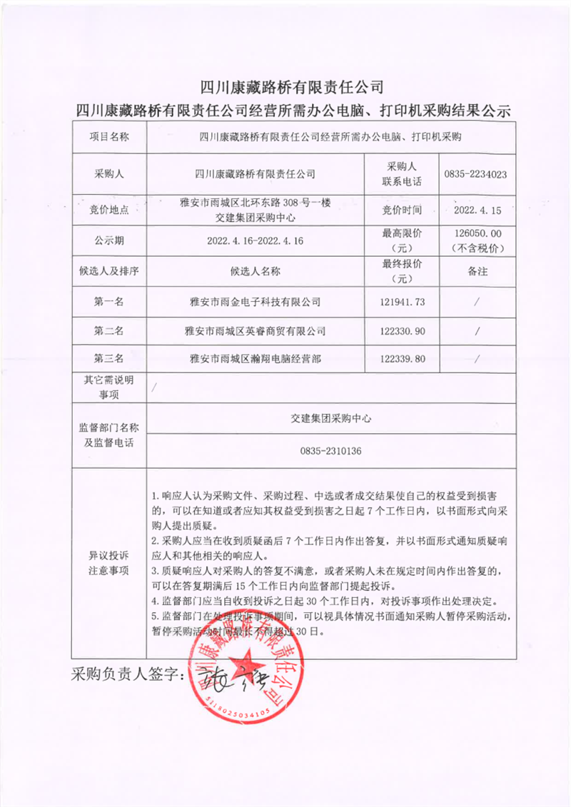 四川康藏路橋有限責(zé)任公司經(jīng)營(yíng)所需辦公電腦、打印機(jī)采購結(jié)果公示