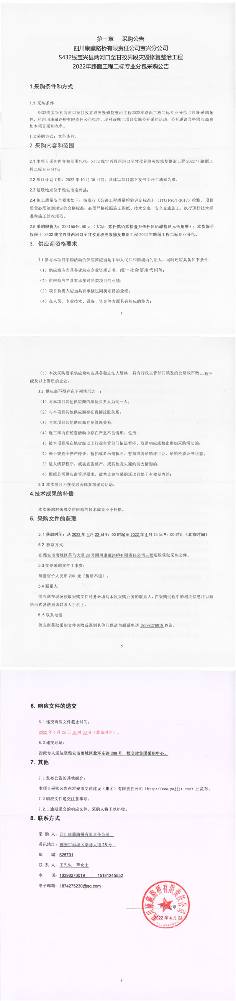四川康藏路橋有限責(zé)任公司S432線寶興縣兩河口至甘孜界段災(zāi)毀修復(fù)整治工程2022年路面工程二標(biāo)專業(yè)分包采購公告