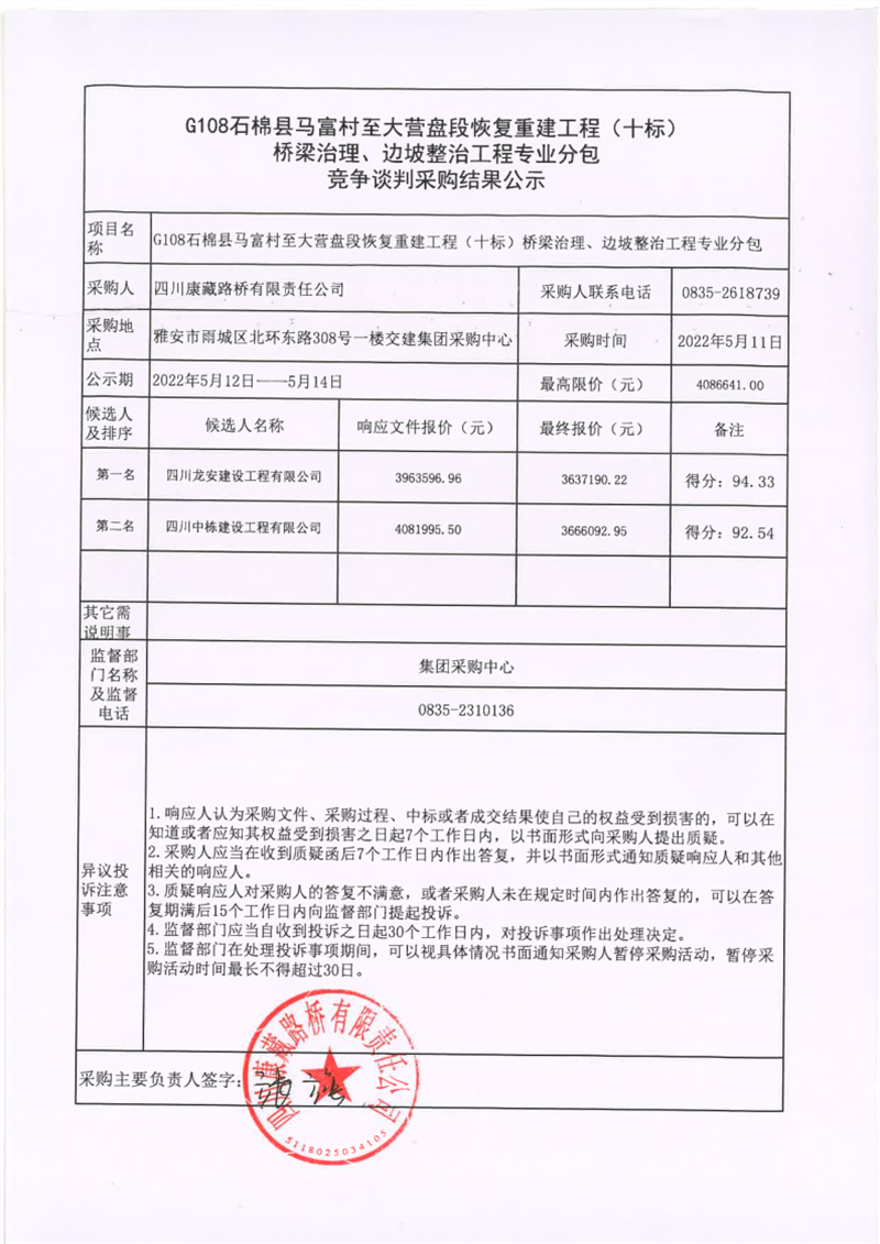 四川康藏路橋有限責(zé)任公司G108線石棉縣馬富村至大營(yíng)盤段恢復(fù)重建工程(十標(biāo))橋梁治理、邊坡整治工程專業(yè)分包競(jìng)爭(zhēng)談判采購(gòu)結(jié)果公示