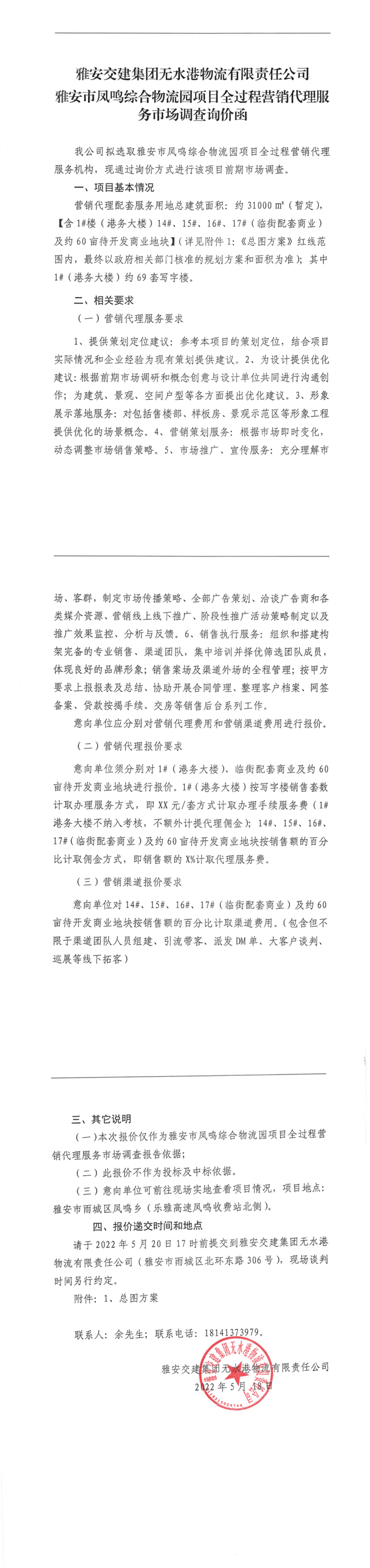 雅安交建集團(tuán)無水港物流有限責(zé)任公司雅安市鳳鳴綜合物流園項(xiàng)目全過程營銷代理服務(wù)市場(chǎng)調(diào)查詢價(jià)函