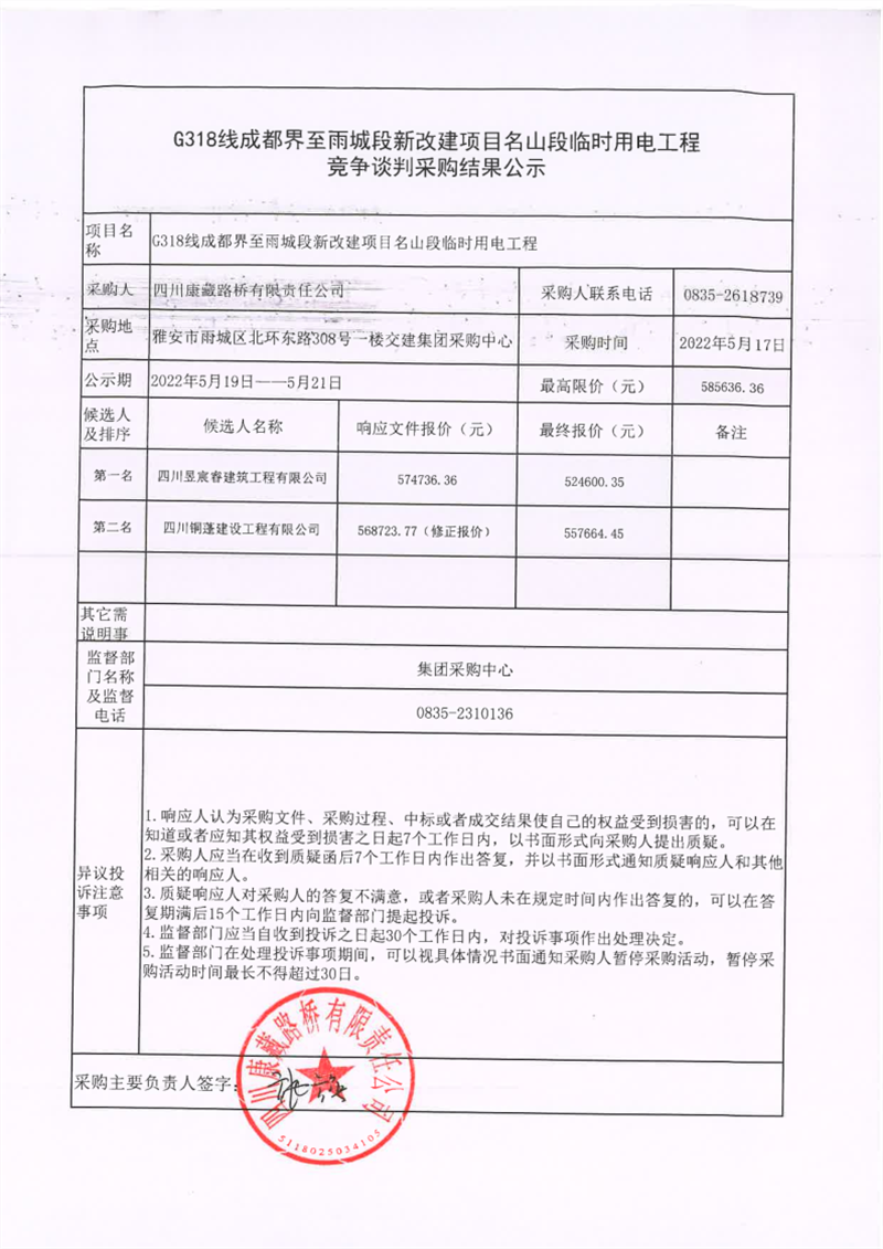 四川康藏路橋有限責(zé)任公司G318線成都界至雨城段新改建項(xiàng)目名山段臨時(shí)用電工程競爭談判采購結(jié)果公示