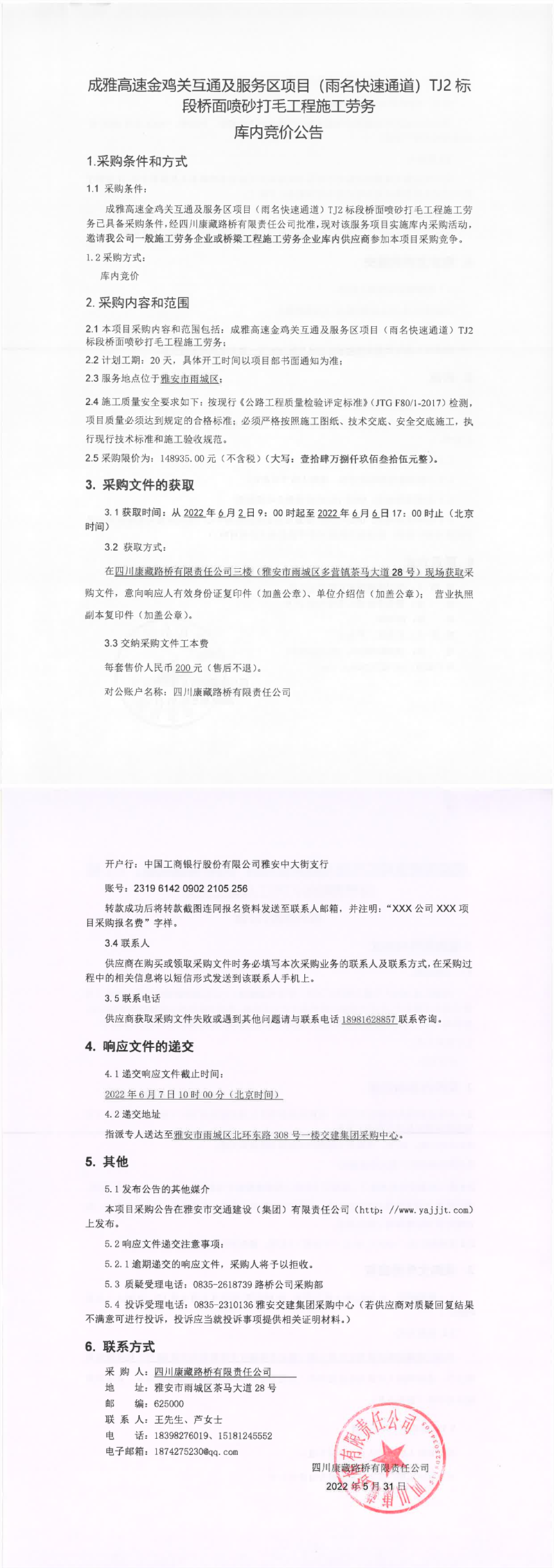 四川康藏路橋有限責(zé)任公司成雅高速金雞關(guān)互通及服務(wù)區(qū)項(xiàng)目(雨名快速通道)TJ2標(biāo)段橋面噴砂打毛工程施工勞務(wù)庫內(nèi)競(jìng)價(jià)公告