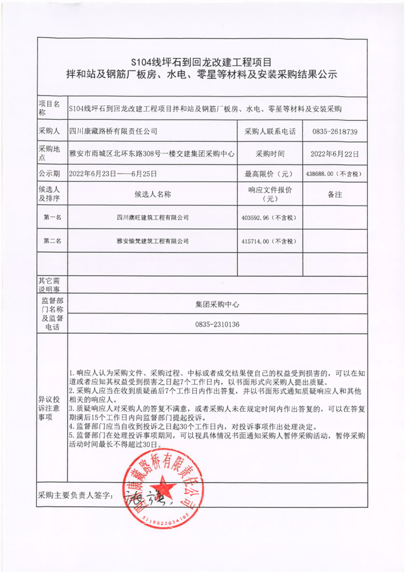 四川康藏路橋有限責(zé)任公司S104線(xiàn)坪石到回龍改建工程項(xiàng)目拌和站及鋼筋廠(chǎng)板房、水電、零星等材料及安裝采購(gòu)結(jié)果公示