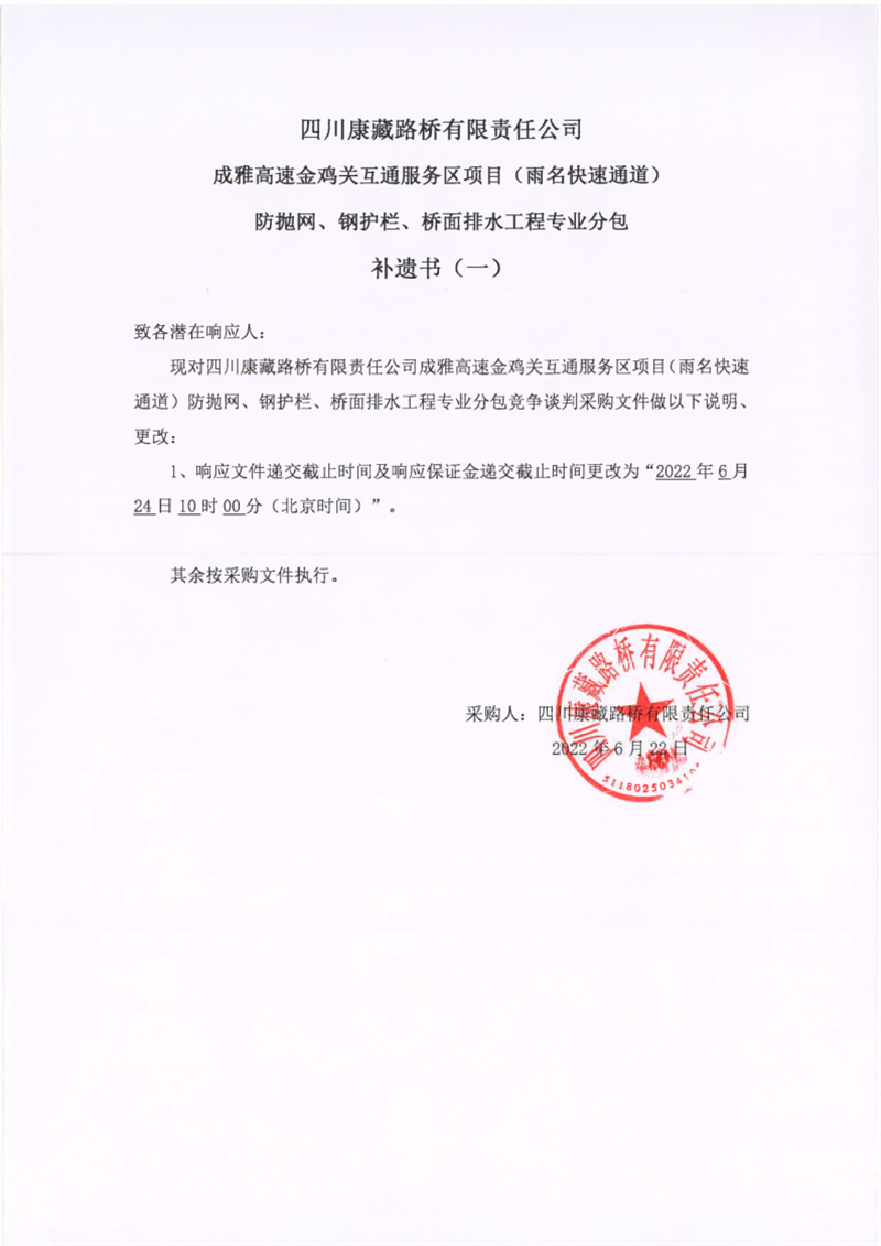 四川康藏路橋有限責任公司成雅高速金雞關互通服務區(qū)項目(雨名快速通道)防拋網(wǎng)、鋼護欄、橋面排水工程專業(yè)分包補遺書(一)