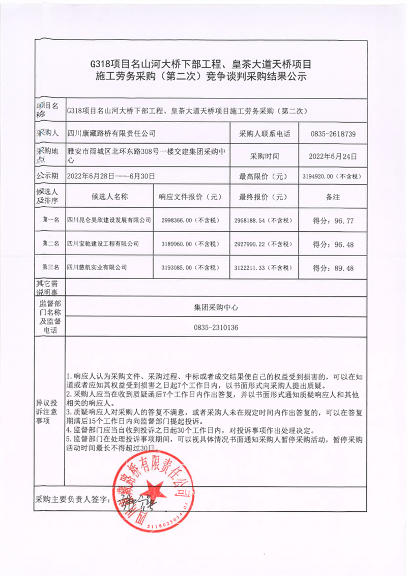 四川康藏路橋有限責任公司G318項目名山河大橋下部工程、皇茶大道天橋項目施工勞務(wù)采購(第二次)競爭談判采購結(jié)果公示