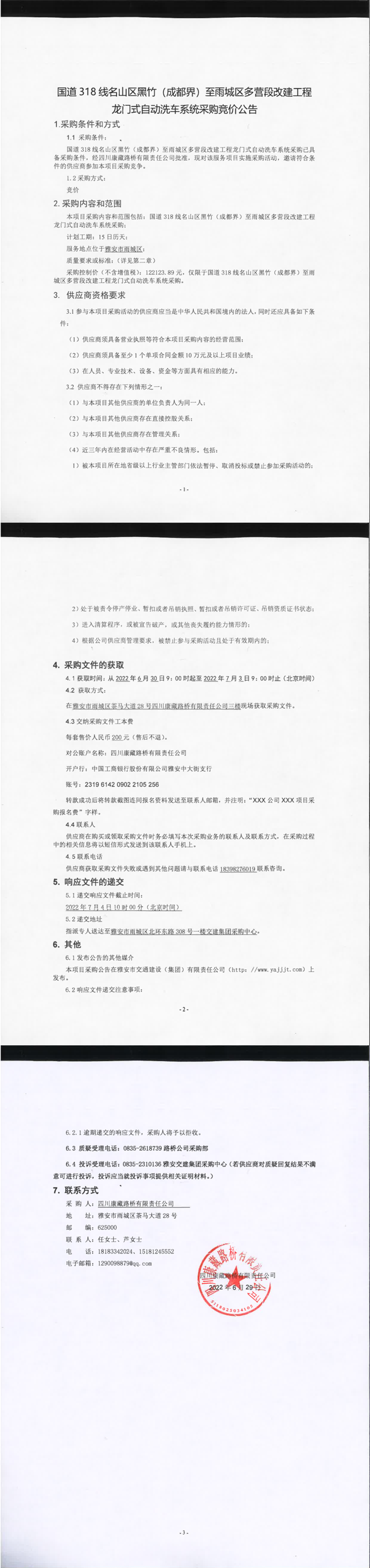 四川康藏路橋有限責(zé)任公司國(guó)道318線(xiàn)名山區(qū)黑竹(成都界)至雨城區(qū)多營(yíng)段改建工程龍門(mén)式自動(dòng)洗車(chē)系統(tǒng)采購(gòu)競(jìng)價(jià)公告