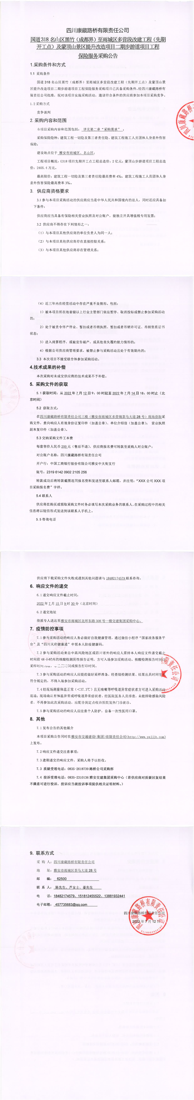 四川康藏路橋有限責(zé)任公司國(guó)道318名山區(qū)黑竹(成都界)至雨城區(qū)多營(yíng)段改建工程(先期開(kāi)工點(diǎn))及蒙頂山景區(qū)提升改造項(xiàng)目二期步游道項(xiàng)目工程保險(xiǎn)服務(wù)采購(gòu)公告