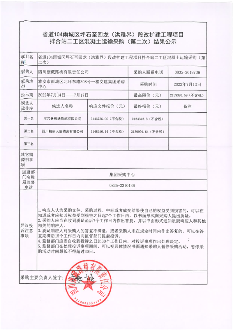 四川康藏路橋有限責(zé)任公司省道104線雨城區(qū)坪石至回龍(洪雅界)段改擴建工程項目拌合站二工區(qū)混凝土運輸采購(第二次)結(jié)果公示