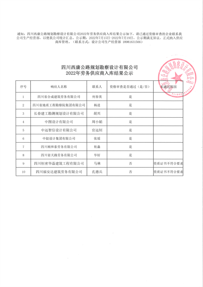 四川西康公路規(guī)劃勘察設(shè)計(jì)有限公司2022年勞務(wù)供應(yīng)商入庫結(jié)果公示