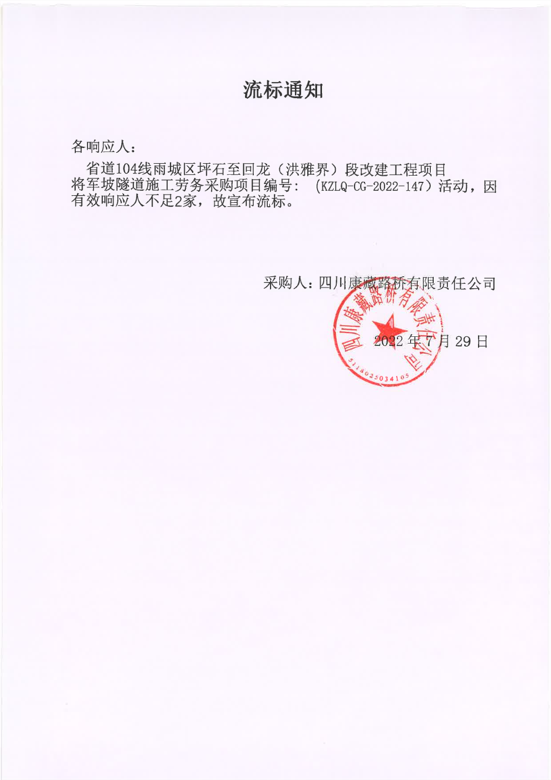 四川康藏路橋有限責任公司省道104線雨城區(qū)坪石至回龍(洪雅界)段改建工程項目將軍坡隧道施工勞采購流標通知