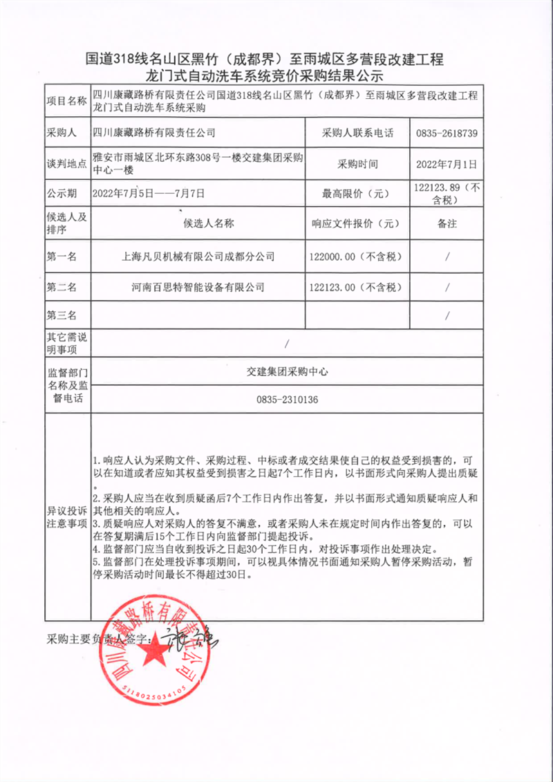 四川康藏路橋有限責任公司國道318名山區(qū)黑竹(成都界)至雨城區(qū)多營段改建工程龍門式自動洗車系統(tǒng)競價采購結果公示