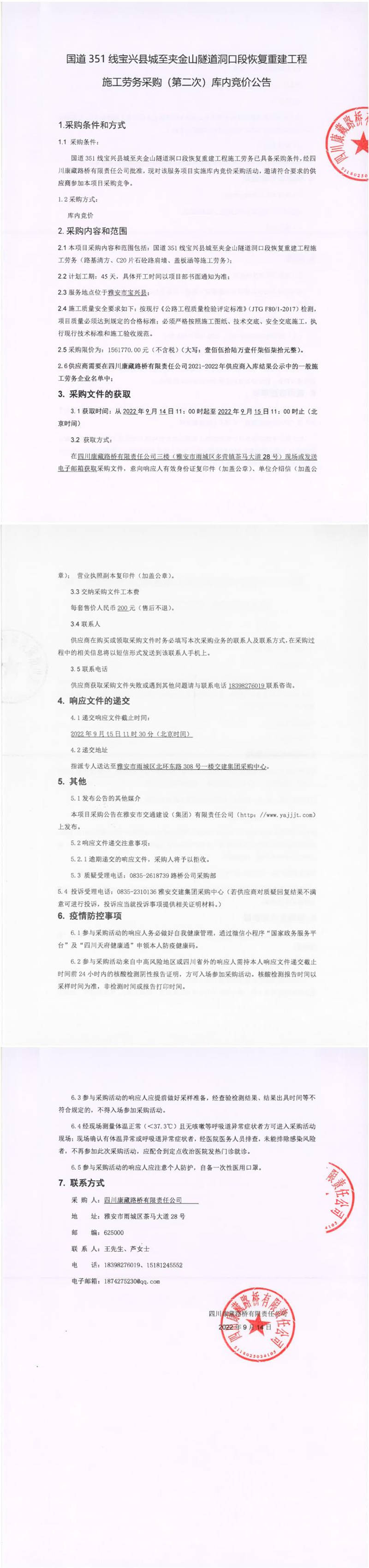 四川康藏路橋有限責任公司國道351線寶興縣城至夾金山隧道洞口段恢復重建工程施工勞務采購(第二次)庫內(nèi)競價公告