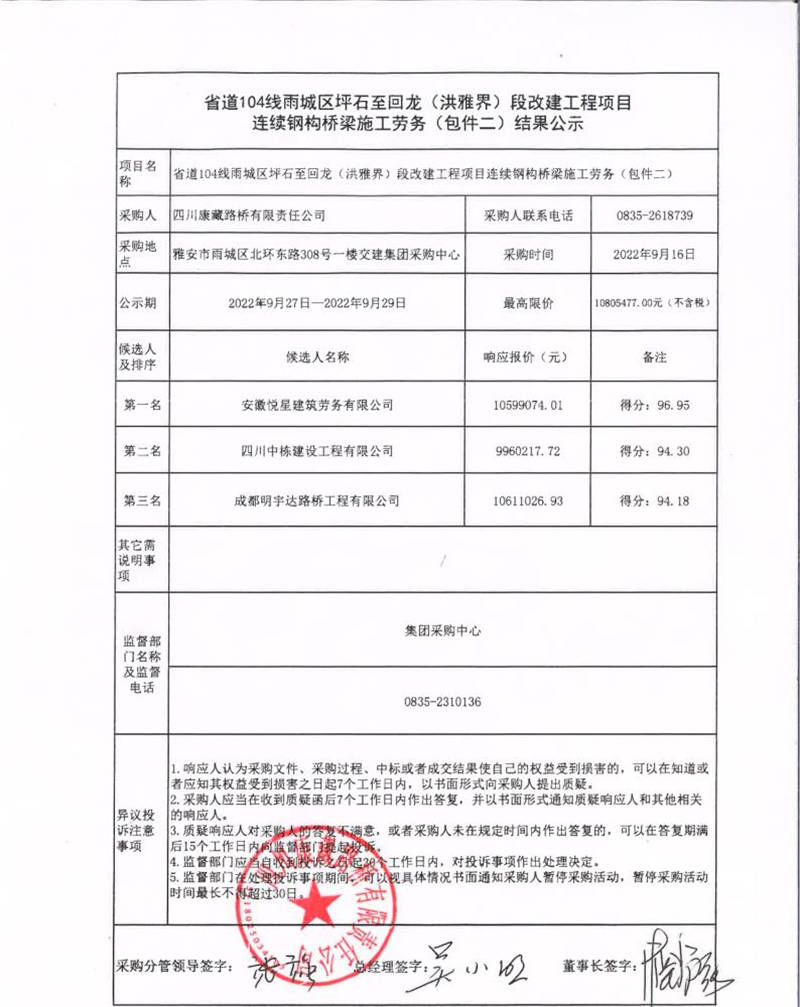 四川康藏路橋有限責(zé)任公司省道104線雨城區(qū)坪石至回龍(洪雅界)段改建工程項(xiàng)目連續(xù)鋼構(gòu)橋梁施工勞務(wù)(包件二)結(jié)果公示