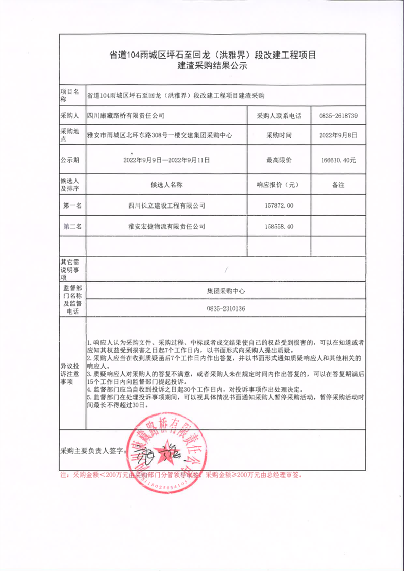 四川康藏路橋有限責任公司省道104雨城區(qū)坪石至回龍(洪雅界)段改建工程項目建渣采購結(jié)果公示