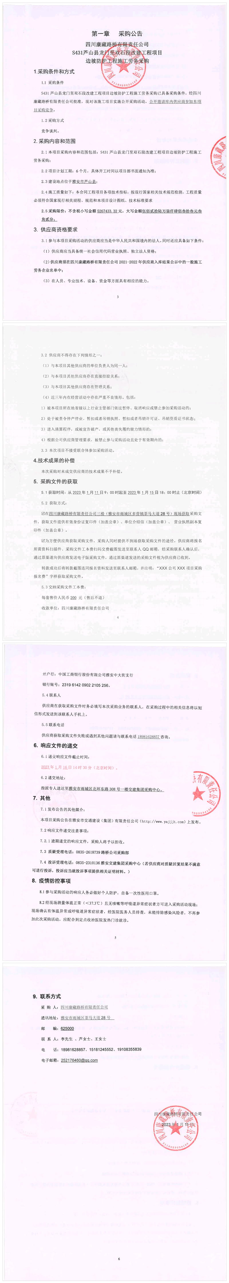 四川康藏路橋有限責(zé)任公司S431蘆山縣龍門至雙石段改建工程項(xiàng)目邊坡防護(hù)工程施工勞務(wù)采購競爭談判結(jié)果公示