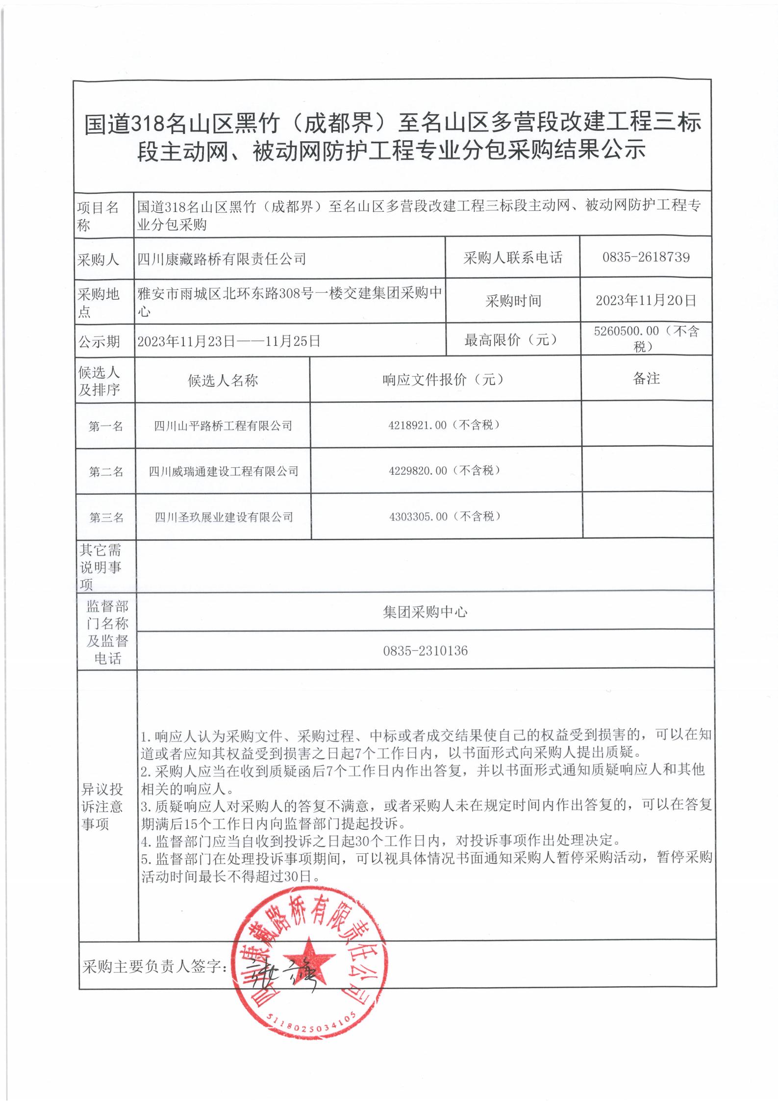 四川康藏路橋有限責任公司國道318名山區(qū)黑竹(成都界)至名山區(qū)多營段改建工程三標段主動網(wǎng)、被動網(wǎng)防護工程專業(yè)分包采購結果公示