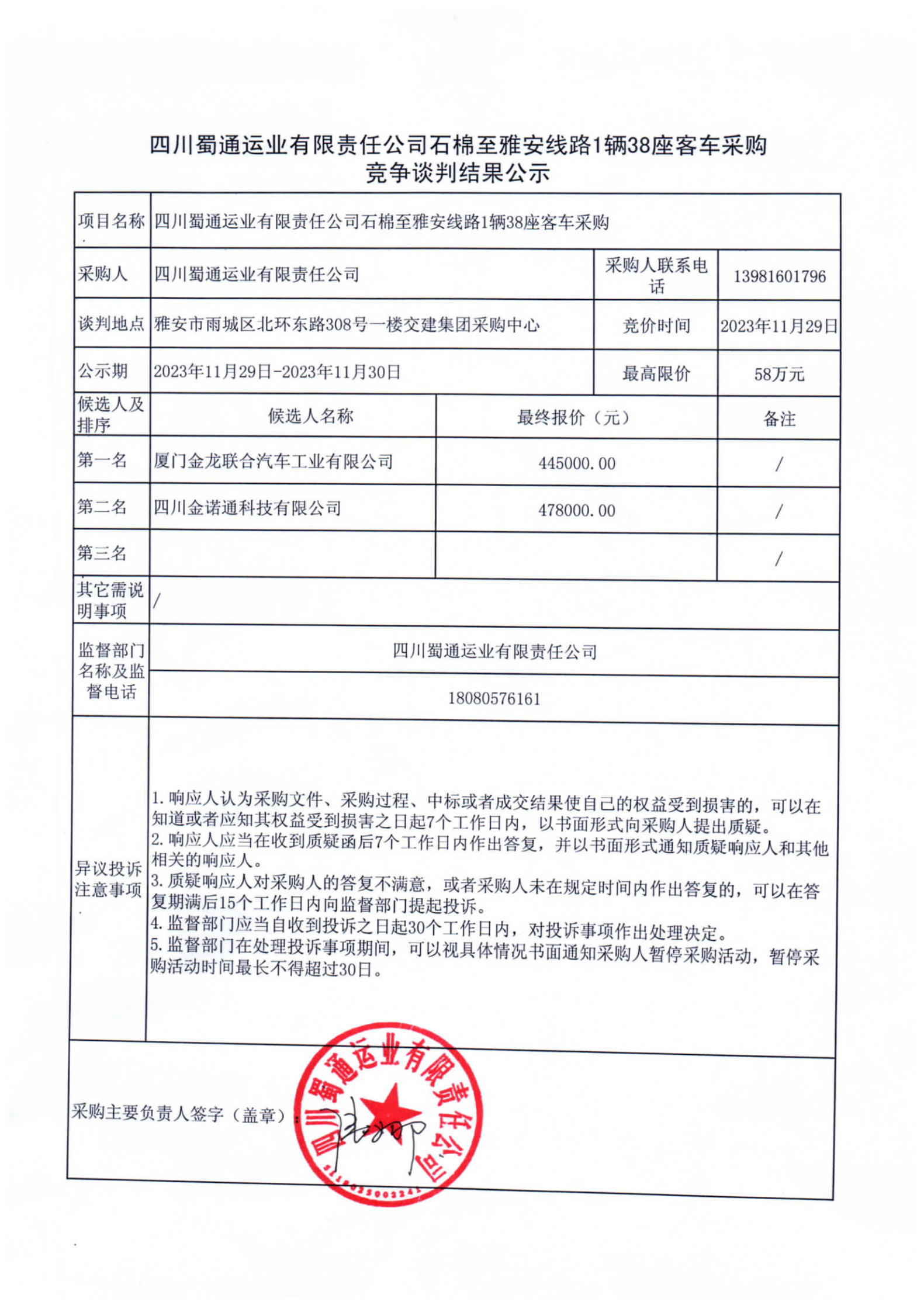 四川蜀通運業(yè)有限責任公司石棉至雅安線路1輛38座客車采購競爭談判結果公示