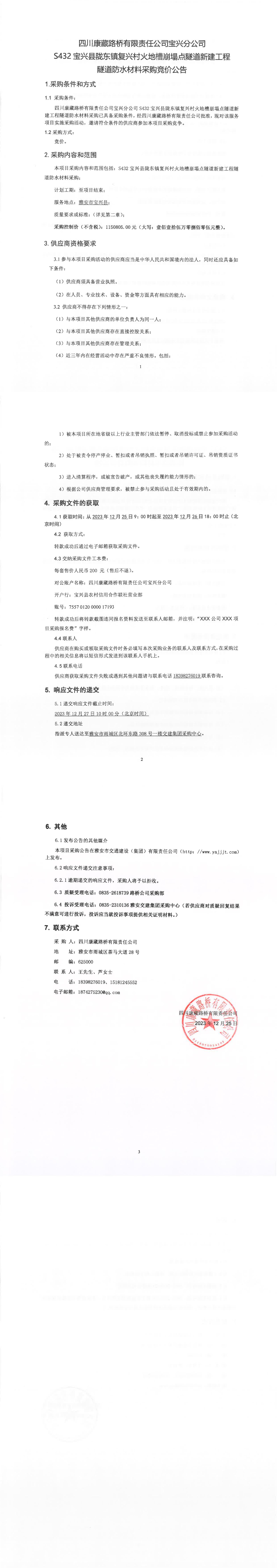 四川康藏路橋有限責(zé)任公司寶興分公司S432寶興縣隴東鎮(zhèn)復(fù)興村火地槽崩塌點(diǎn)隧道新建工程隧道防水材料采購競(jìng)價(jià)公告