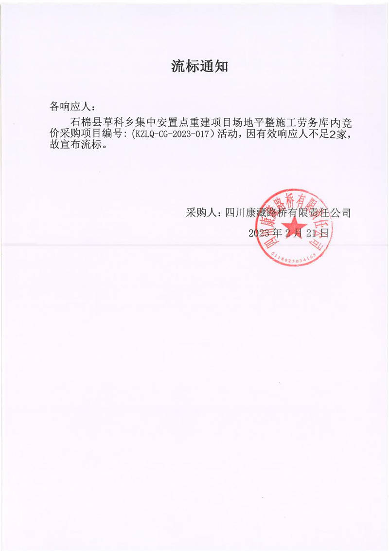 四川康藏路橋有限責(zé)任公司石棉草科鄉(xiāng)集中安置點重建項目場地平整施工勞務(wù)庫內(nèi)施工勞務(wù)庫內(nèi)采購流標通知