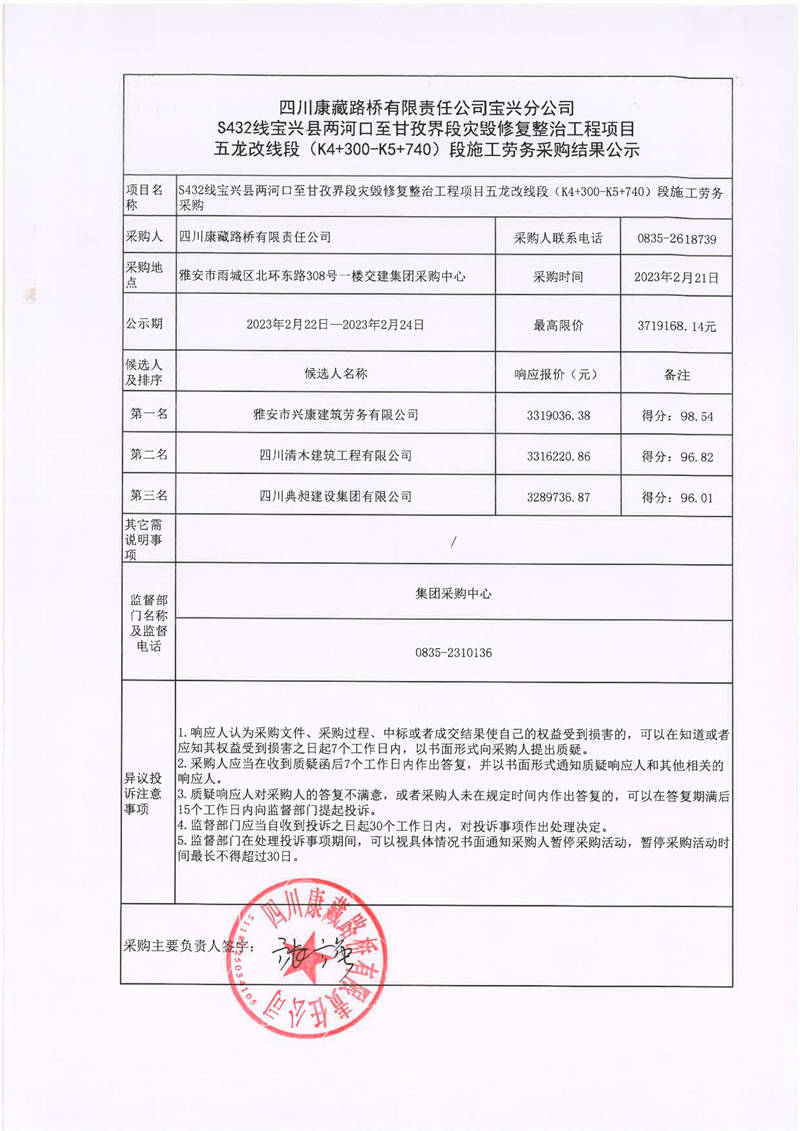 四川康藏路橋有限責(zé)任公司寶興分公司S432寶興縣兩河口至甘孜界段災(zāi)毀修復(fù)整治工程項(xiàng)目五龍改線(xiàn)段(K4+300-K5+740)段施工勞務(wù)采購(gòu)結(jié)果公示